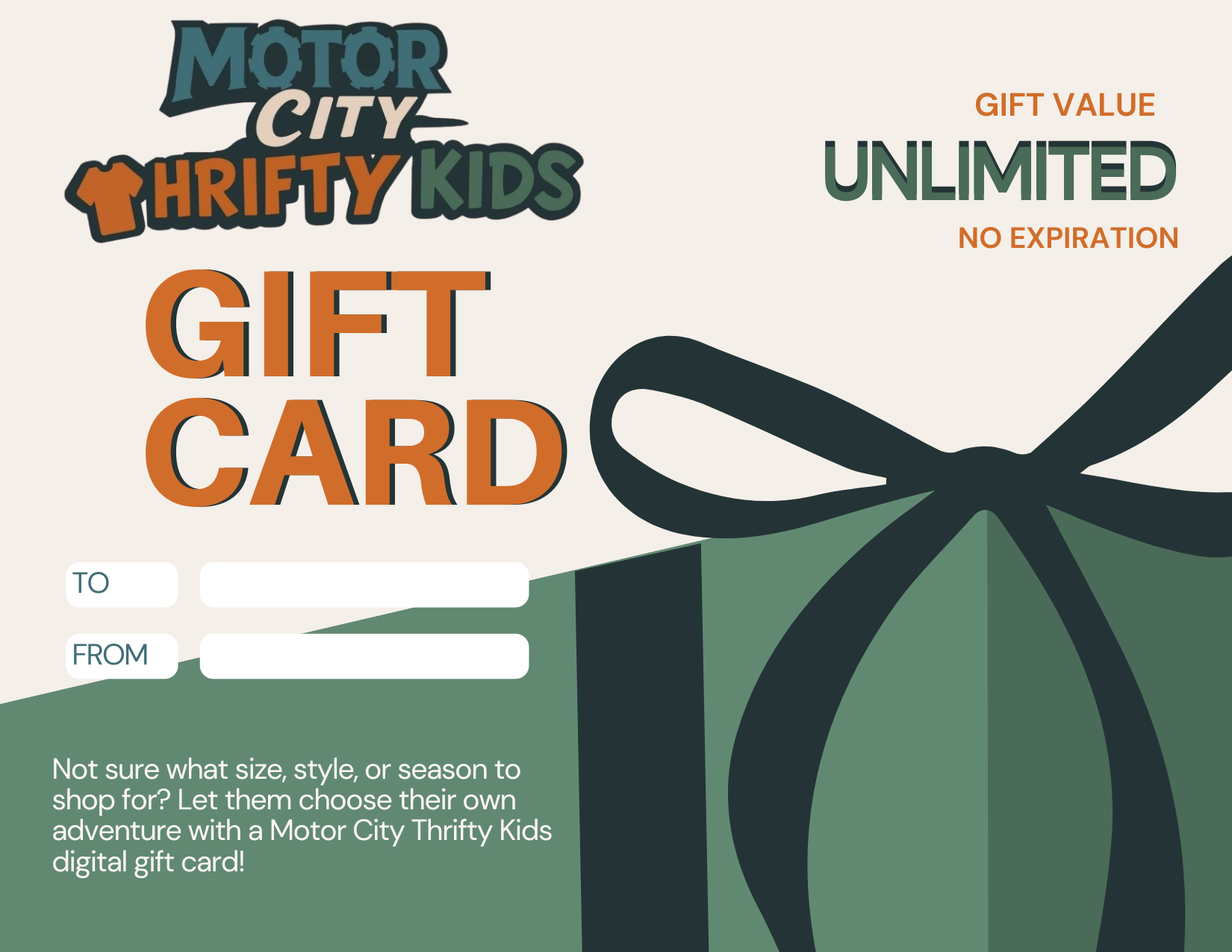 Not sure what size, style, or season to shop for? Let them choose their own adventure with a Motor City Thrifty Kids digital gift card!